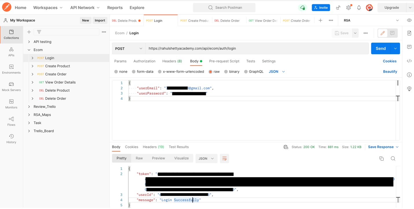 - Response: below is the response that I got. There are token, userID, and also message “Login Successfully”. I have to use this token as an authorization in all subsequent calls what I make in this application.