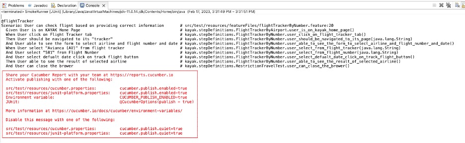 - Also, I set monochrome = true to specify the console output from Cucumber in a readable format.